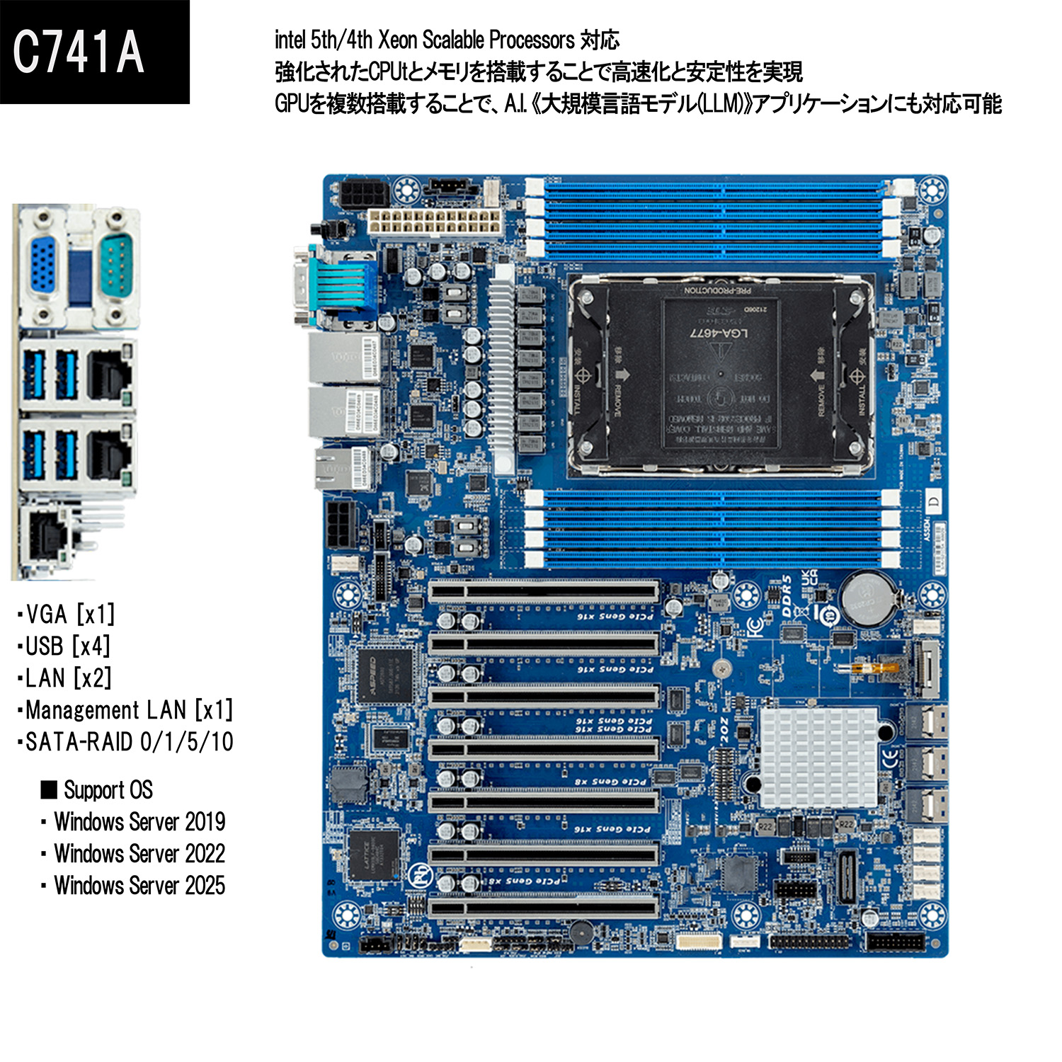 ≪第5/第4世代 Intel Xeon スケーラブル・プロセッサー対応≫ 高性能サーバー向けATXマザーボード。最大350WのTDPに対応し、最新のDDR5メモリとPCIe Gen5スロットを搭載。 |