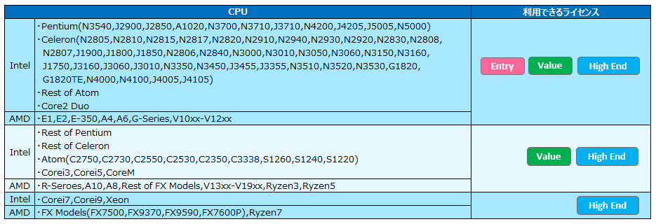 各エディションによるOSの機能に違いはありませんが、「Entry」「Value」「High End」で価格体系が異なりますので、ご利用のパソコンの搭載CPUに応じて最適のものをお選びください。
