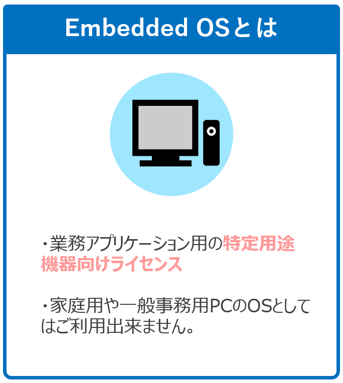 「Embedded OS」は業務アプリケーションなどの特定用途向けのOSで、組み込みシステムなどさまざまなデバイスに利用することができますが、家庭用や一般事務用などの汎用向けの用途としては利用することはできないOSライセンスとなります。