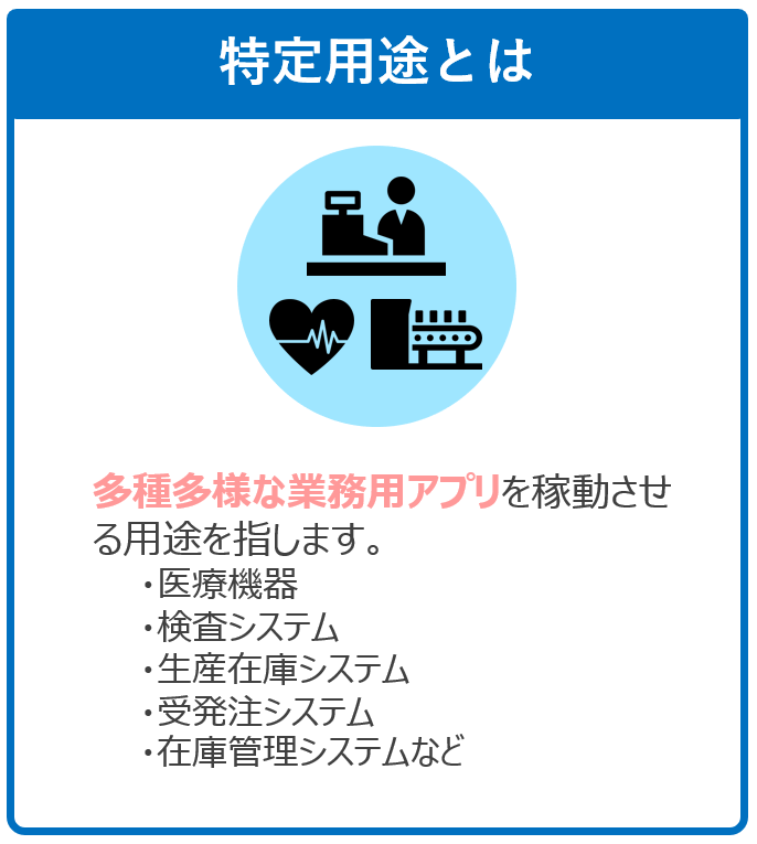 「特定用途」とは 医療システム、POSシステム、在庫管理システム、受発注システムといった業務用アプリケーションを稼動させるといった特定の用途を指します。