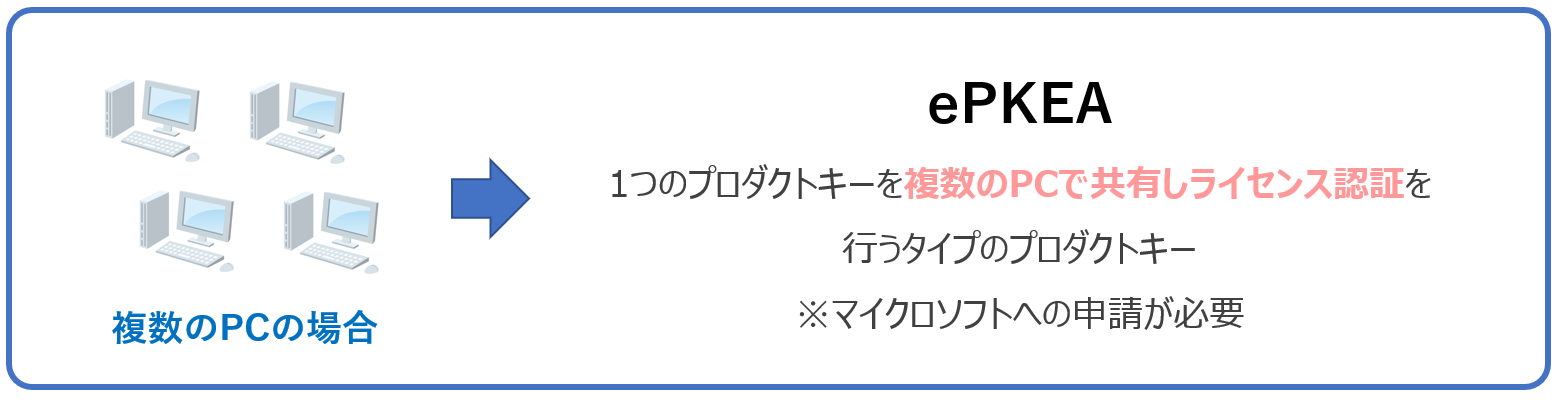 「ePKEA」のプロダクトキーは、ひとつのプロダクトキーを複数のパソコンで共有しパソコンごとの入力が不要なので、導入するパソコン台数が多い場合に適したプロダクトキーとなっています。