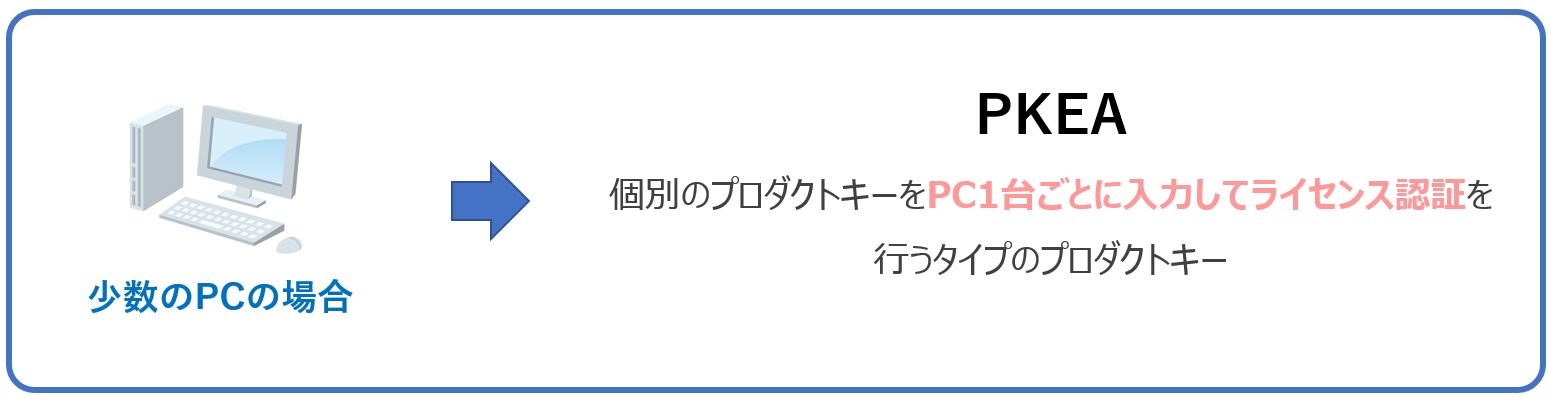 「PKEA」のプロダクトキーは、ひとつのプロダクトキーを1台のパソコンに入力してライセンス認証を行うので、導入するパソコン台数が少ない場合に適したプロダクトキーとなっています。