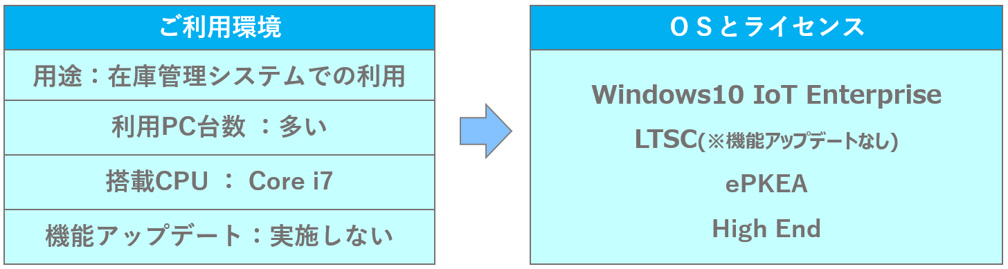 在庫管理システムのような特定用途でのご利用で、利用するパソコンの台数が多く、搭載CPUはIntelのCorei7、機能アップデートを行わないケースの場合、OSの種類は「Windows10 IoT Enterprise」の「LTSC」モデル、「ePKEA」のプロダクトキーで、「High End」のライセンスでの運用が可能です。