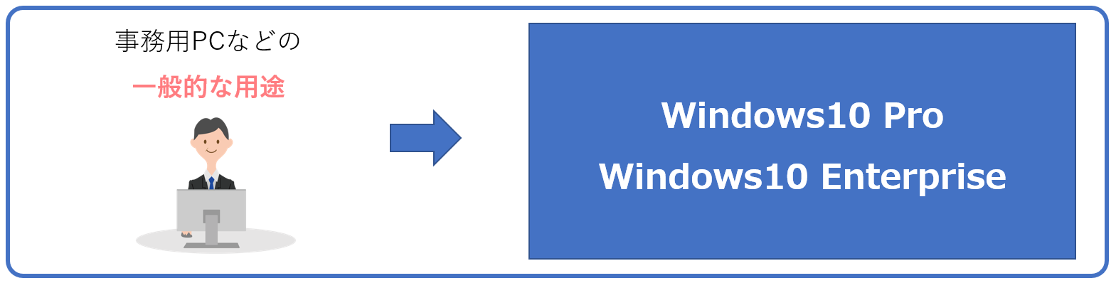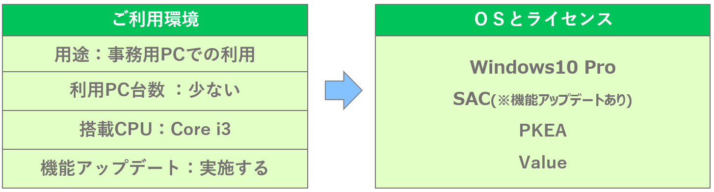 事務用パソコンなどの一般用途向けのご利用で、利用するパソコン台数が少なく、搭載CPUはintelのCorei3、機能アップデートを行い最新のOSバージョンを利用したい場合、OSの種類は「Windows10 Pro」または「Windows10bEnterprise」の「SAC」モデル、「PKEA」のプロダクトキーで、「Value」のライセンスでの運用が可能です。