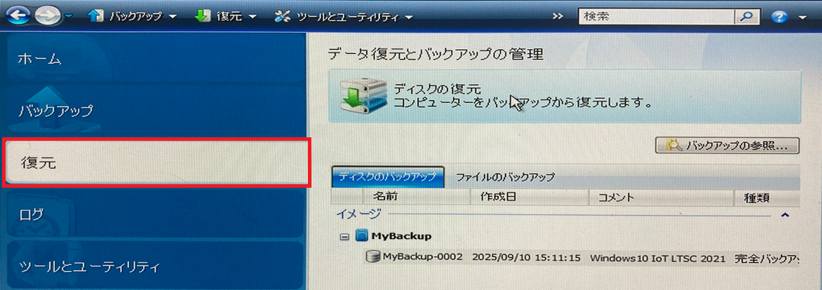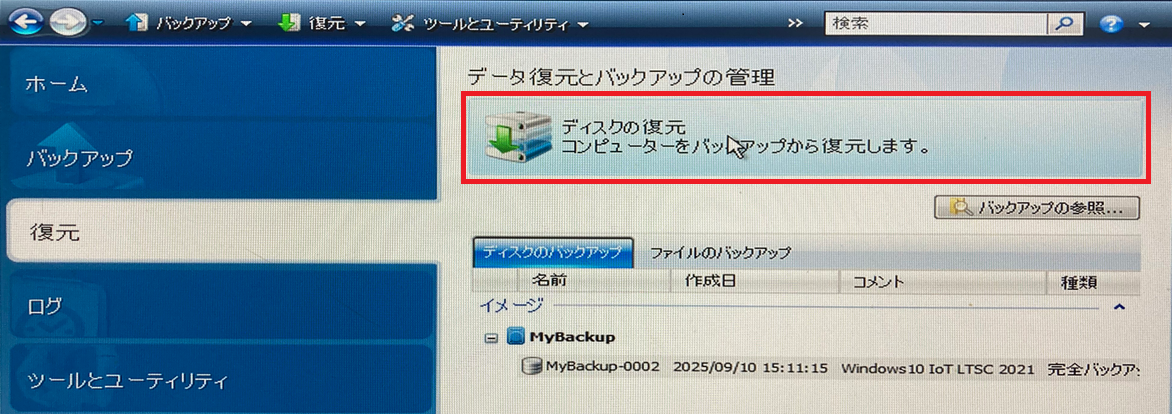 ※この画面では弊社出荷時のバックアップイメージを選択しています。