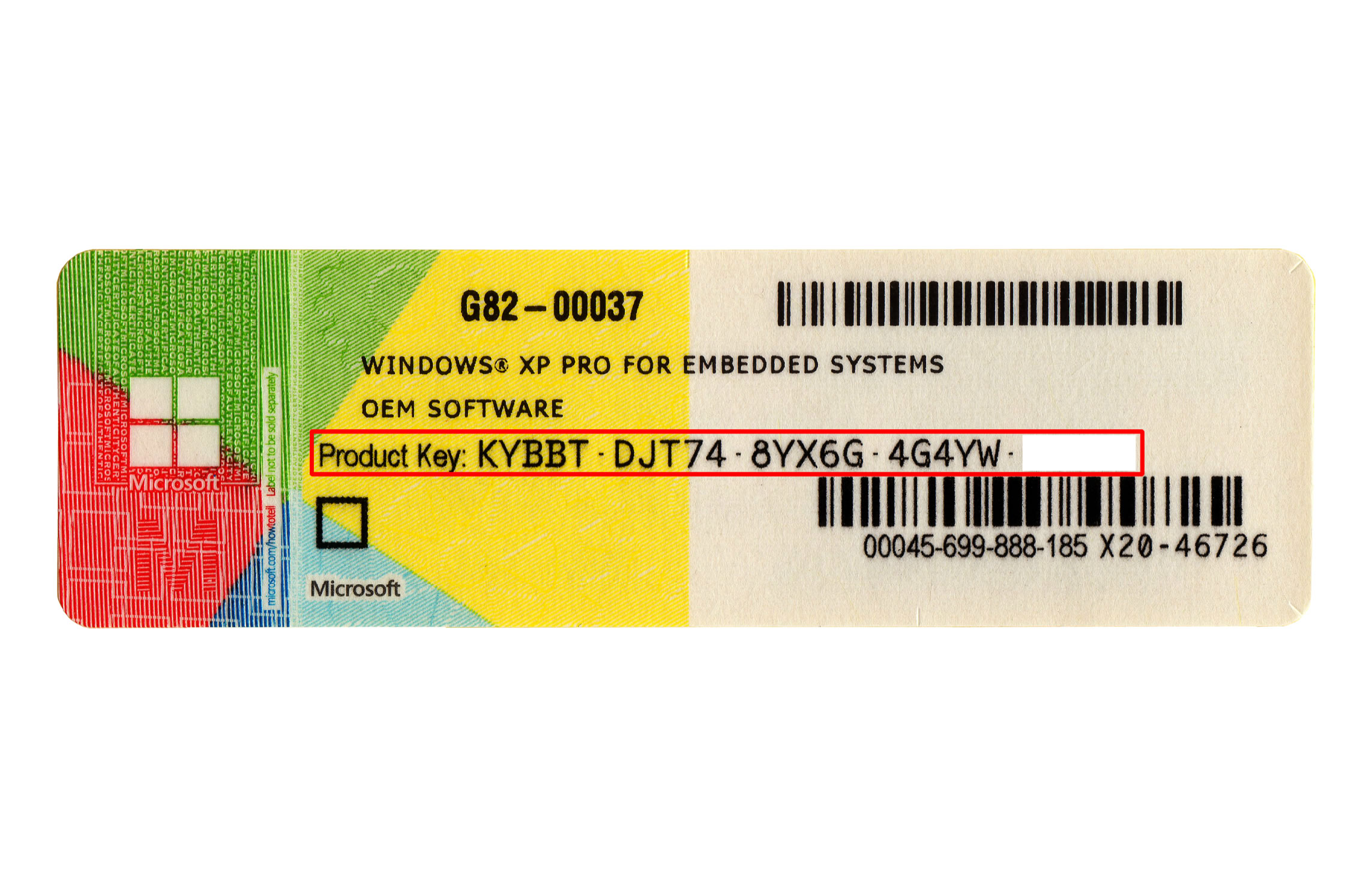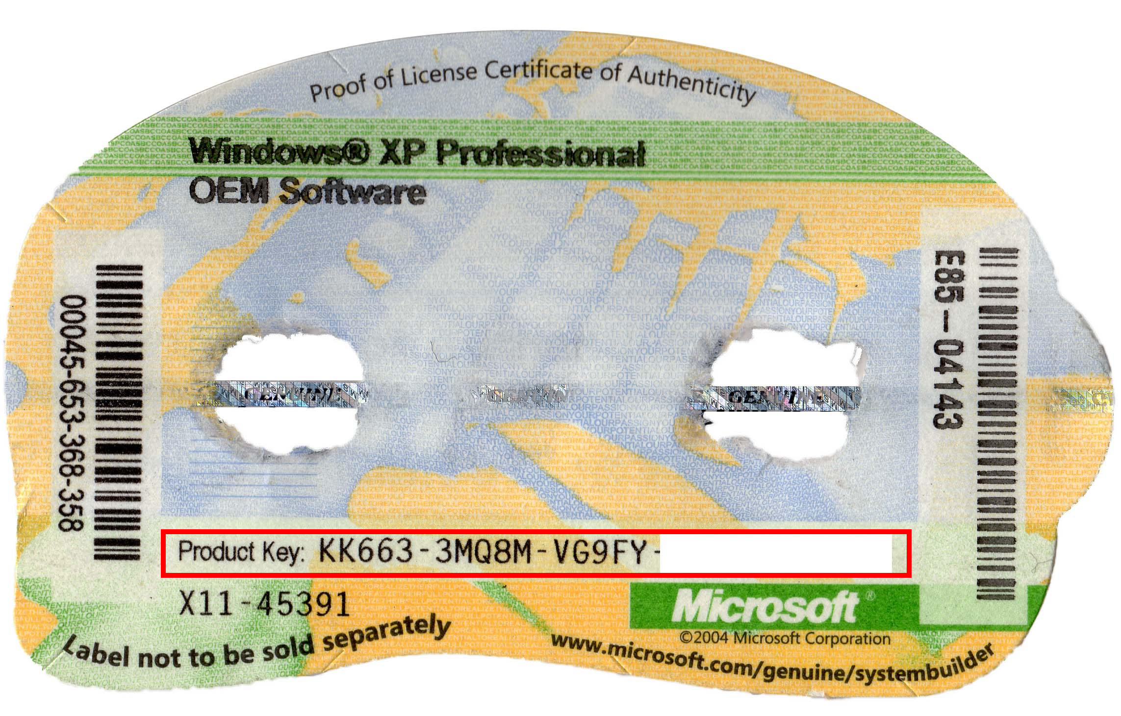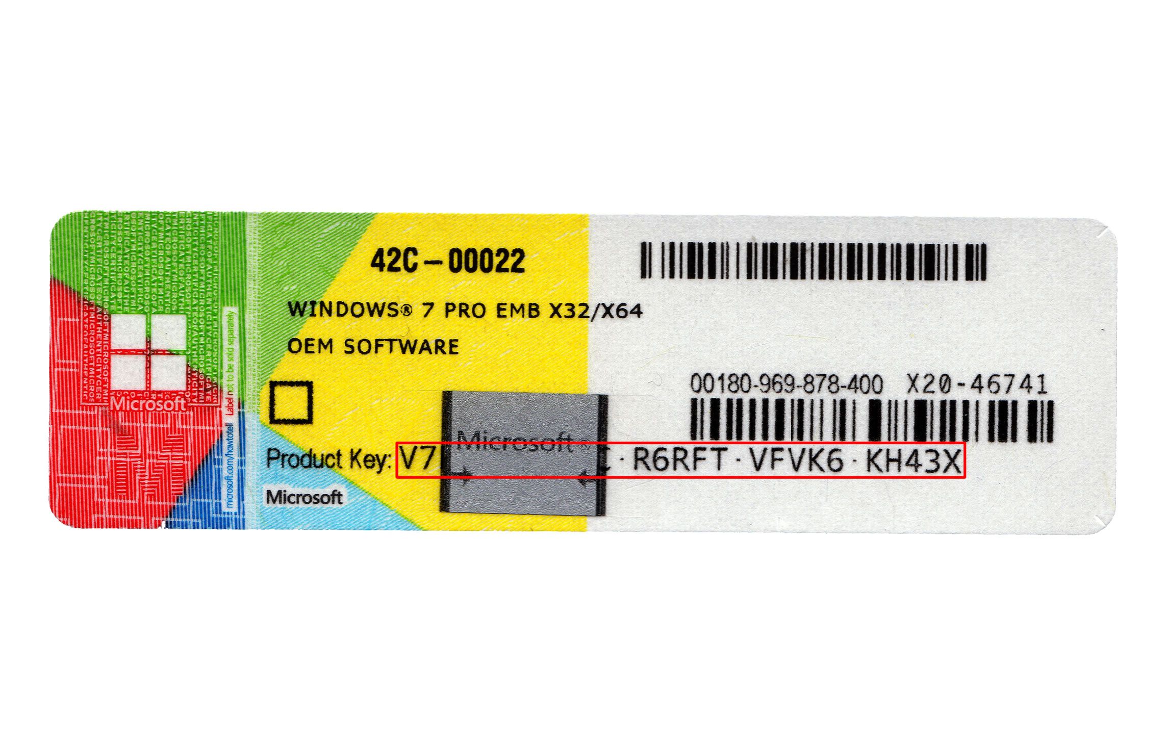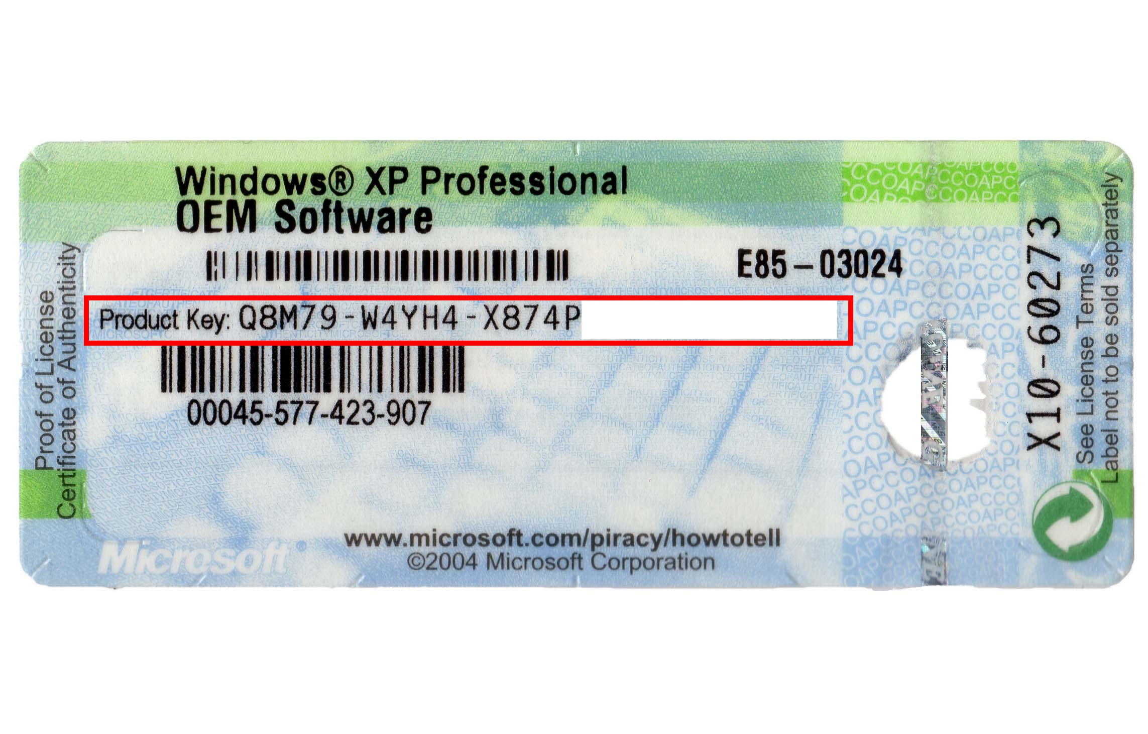 通常お手持ちのパソコン本体に貼り付けられているCOAラベル(シール)にプロダクトキーは印字されています。(画像赤枠部分) ※画像クリックで拡大 |