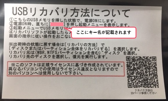 添付USBの袋に記載の起動キーを押しながらPCを起動