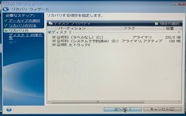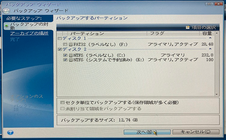 お客様の環境でバックアップ対象のパーティションを選択し、次へをクリック