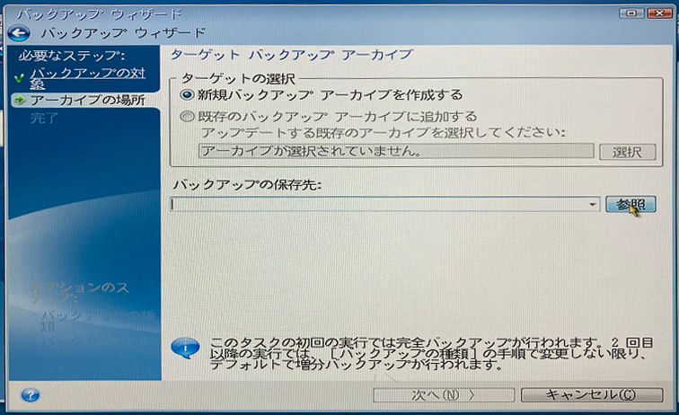 「バックアップ保存先」の参照ボタンをクリック