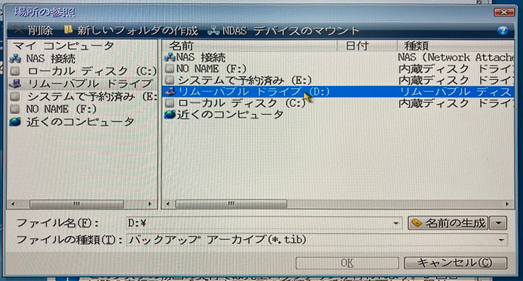 表示された参照先からバックアップ保存先を選択