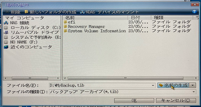 バックアップファイル名を入力し、OKをクリック