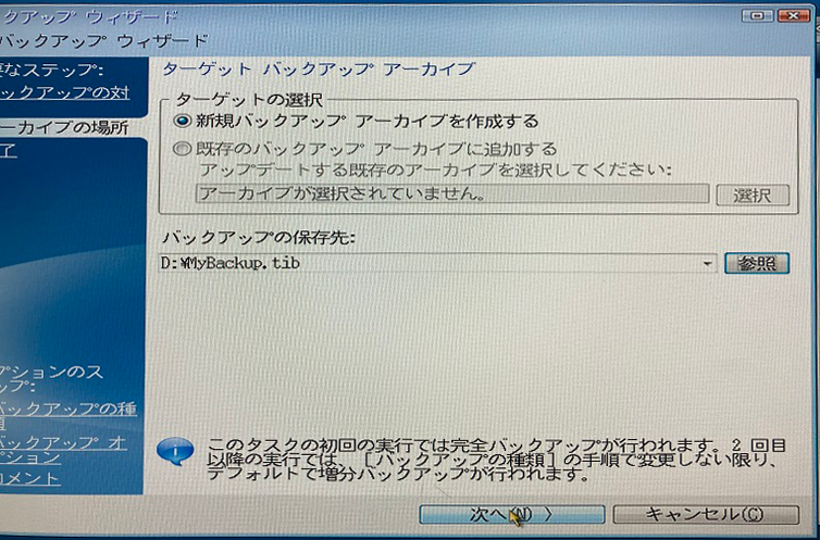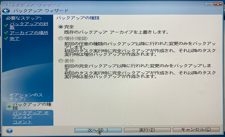 バックアップの種類は「完全」にチェックし「次へ」をクリック