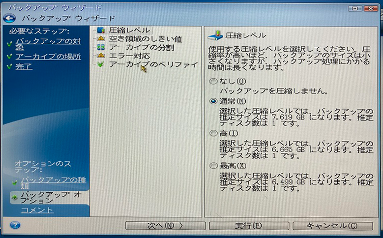 ・バックアップしたい記憶領域と保存先メディアを指定してバックアップを実施