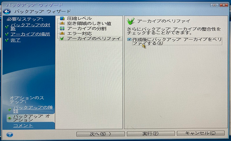 「作成後にバックアップアーカイブをベリファイする」にチェックし「次へ」をクリック