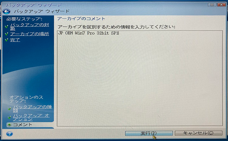「アーカイブのコメント」に任意のコメントを入力し「実行」をクリック